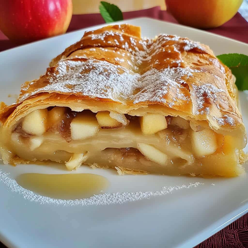- Cool and Dust: Allow the strudel to cool for 10 minutes before dusting with powdered sugar. Slice and serve warm or at room temperature.
