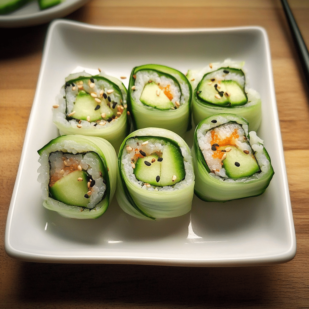 Cucumber Wrapped Sushi Rolls are a refreshing and elegant way to enjoy sushi with a healthy twist. The crisp, hydrating cucumber adds a satisfying crunch that perfectly complements the flavorful fillings, creating a harmonious balance of texture and taste in every bite.