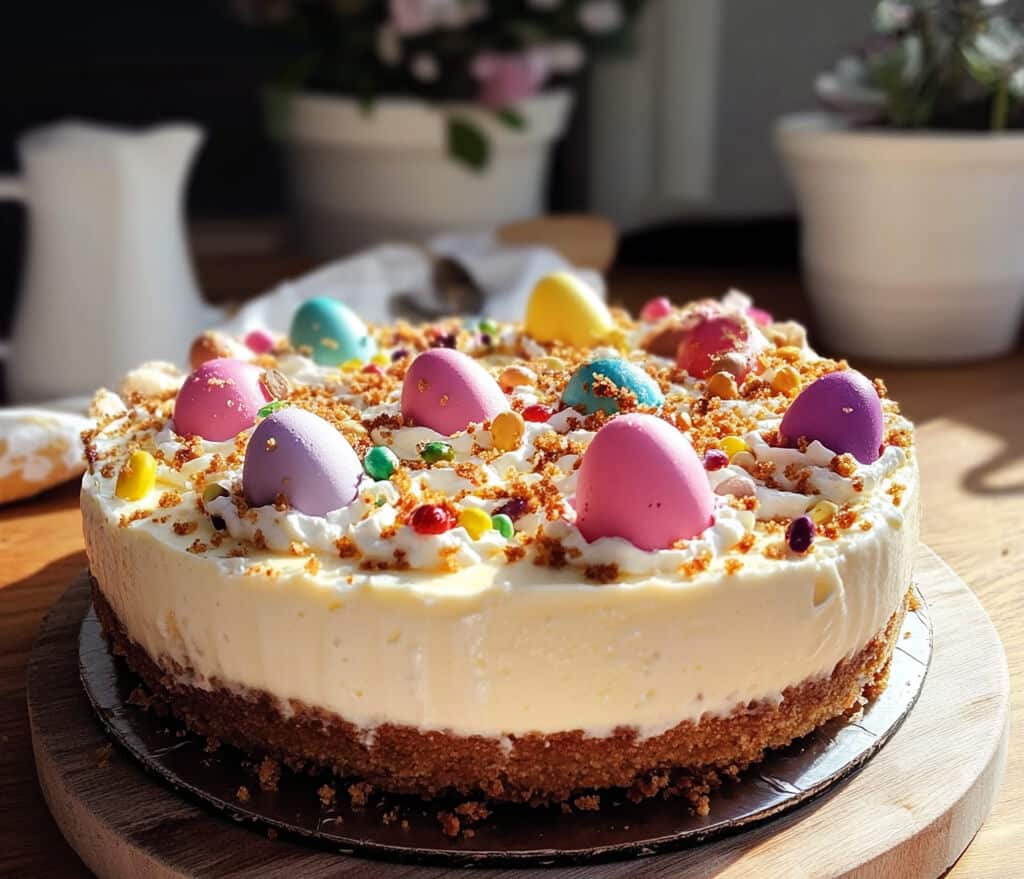 - Decorate: Once chilled, top the cheesecake with mini chocolate eggs and sprinkles. Add whipped cream if desired.