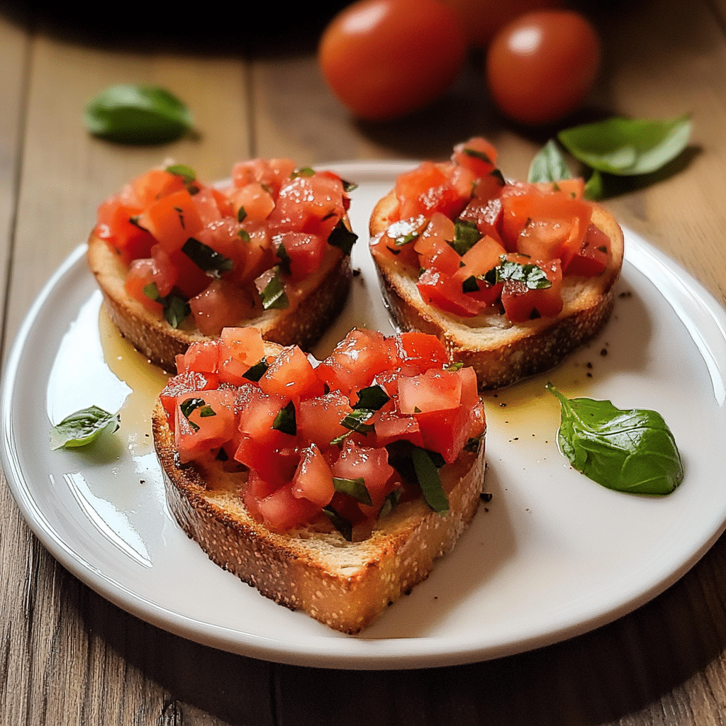 This bruschetta always reminds me of sunny afternoons spent with friends. I first made it for a casual get-together, and the heart-shaped twist made it feel extra special. The scent of garlic toasting on the bread fills the air, signaling the start of something delicious. The final touch of balsamic glaze adds a tangy sweetness that perfectly complements the tomatoes and basil, creating a dish that feels light yet satisfying.