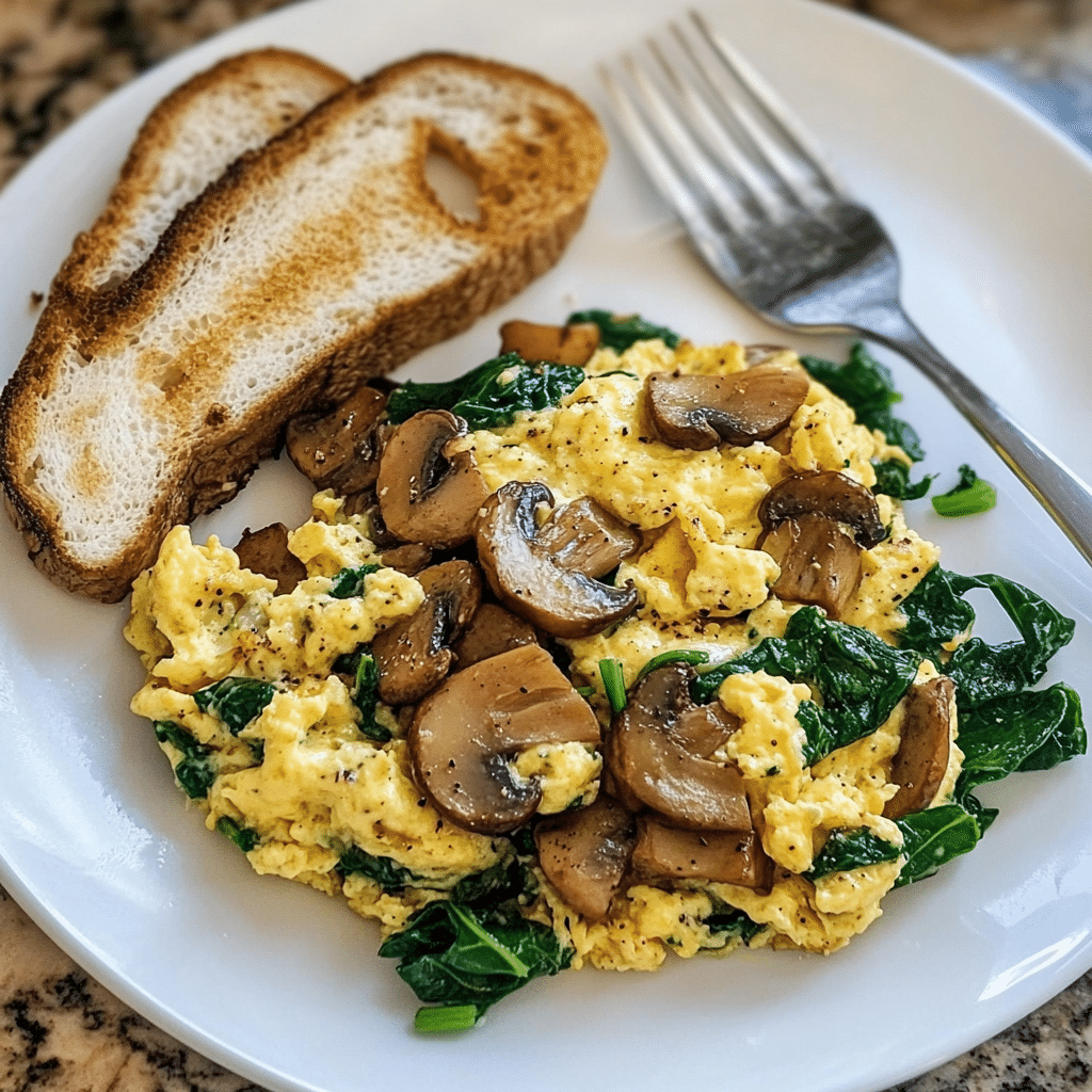 Mushroom-Spinach Scrambled Eggs is perfect for busy mornings or leisurely weekend brunches. It’s incredibly versatile—serve it with toast, sprinkle it with freshly grated Parmesan, or enjoy it alongside crispy hash browns for a more indulgent spread. Whether you’re making breakfast for one or a crowd, this dish is a crowd-pleaser that always hits the spot. If you’re looking for a flavorful and healthy way to start your day, Mushroom-Spinach Scrambled Eggs is the dish to make!