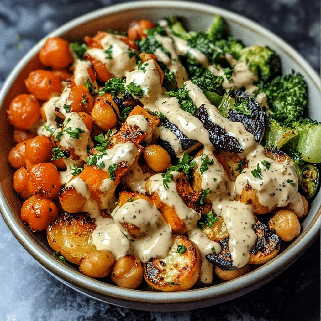I first discovered this bowl during a week of experimenting with plant-based meals, and it quickly became a staple in my kitchen. The roasted vegetables, often a mix of sweet potatoes, carrots, and Brussels sprouts, create a comforting base while the chickpeas add a satisfying crunch. The tahini dressing, made with a blend of sesame paste, lemon juice, and garlic, adds a luscious and tangy finish that takes the dish from simple to spectacular.