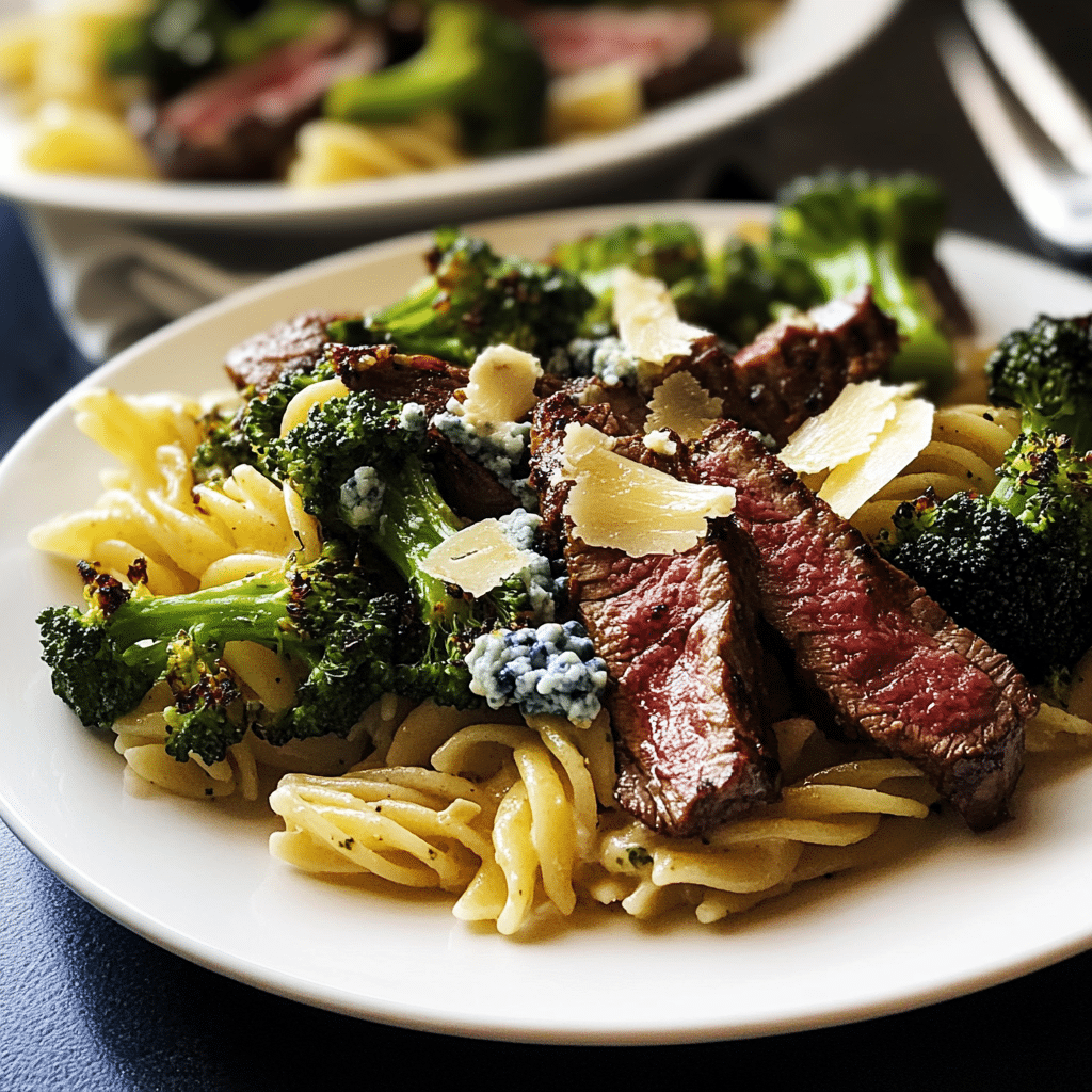 Steak and Blue Cheese Pasta with Roasted Broccoli is a meal that promises to impress with its bold, savory flavors and comforting textures. The perfectly cooked steak adds a rich, juicy element, while the creamy blue cheese sauce brings a sharp, tangy contrast that elevates the entire dish. The roasted broccoli adds a subtle smoky depth, balancing the richness of the pasta.
