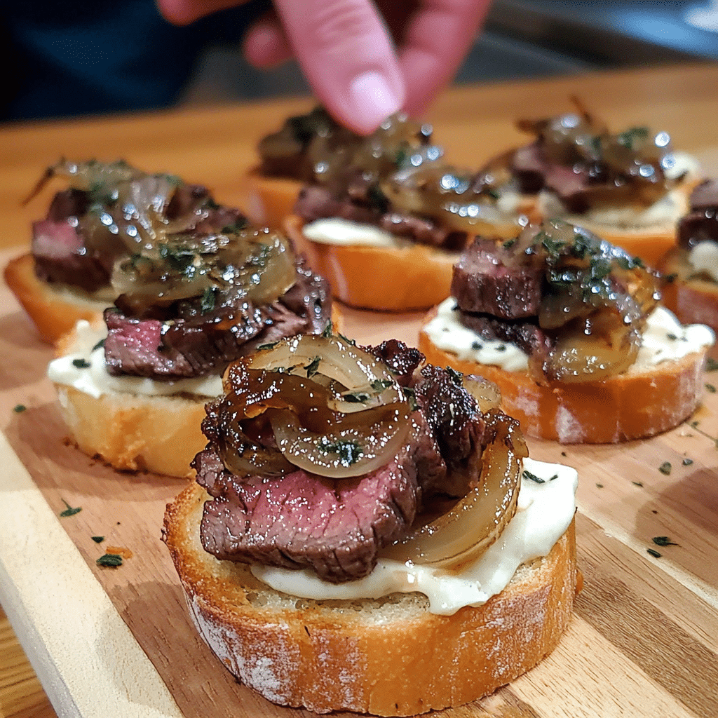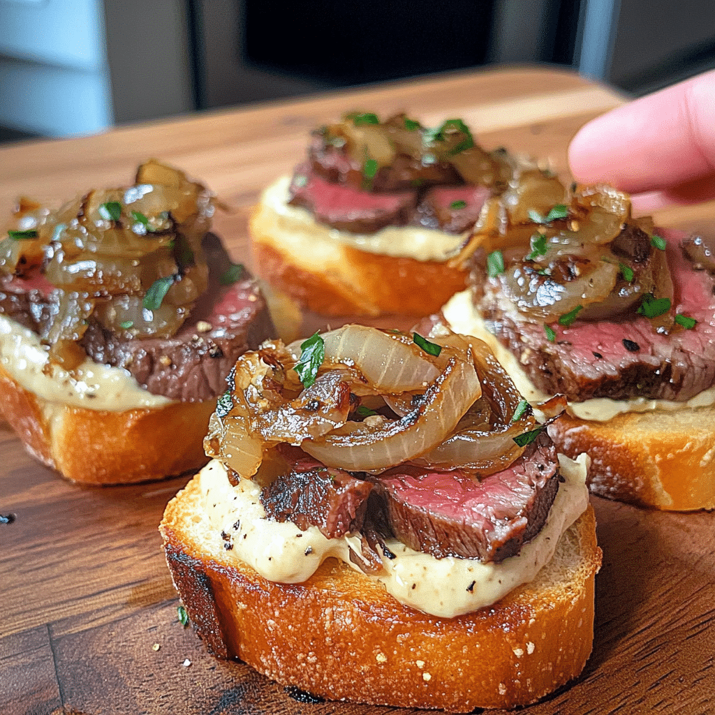 - Build the Crostini: Spread a small spoonful of the horseradish sauce onto each toasted baguette slice. Top with a slice of steak and a generous spoonful of caramelized onions. Garnish with fresh parsley, if desired, and serve immediately.